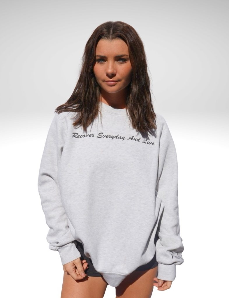 “Recover Everyday And Live” across chest with Real across the left wrist above the cuff.